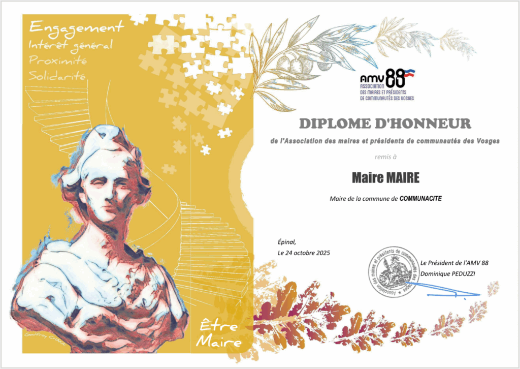Mandature 2020-2026 : lors de l’assemblée générale 2025 de l’AMV 88, organisée dans le cadre de la “Journée des élus vosgiens et des agents des collectivités“, une cérémonie a été organisée afin de remettre ce diplôme aux élu(e)s ayant au moins trois mandats de maire à leur actif.